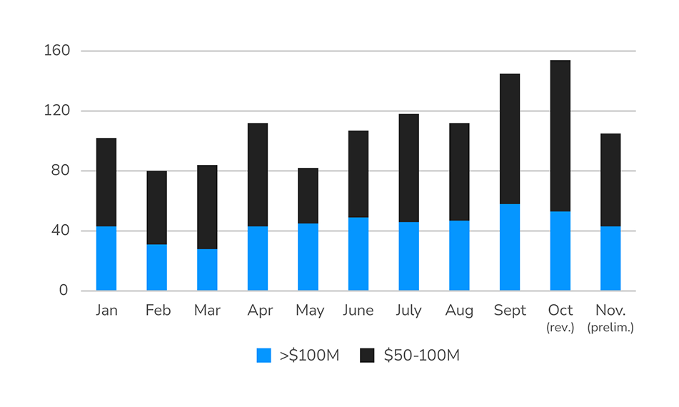 Deal momentum held up in November, with 1,214 transactions totaling $23.8B, a solid performance for a shorter month. Activity eased from October’s peak, but a November cooldown is entirely normal, and this year’s dip was amplified by Thanksgiving week and the shutdown that extended into mid-month. Big-ticket trades continued, just at a slower pace, and overall deal flow still signaled an active market rather than one losing steam.