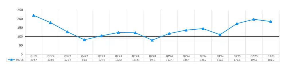 The LightBox Property Listings Index edged down 6% in Q3, from 197.2 to 185.0, reflecting typical seasonality rather than weakening momentum. July and August listings fell 2% and 12%, following June’s exceptionally strong pace, consistent with a midsummer lull, before surging 25% in September to the highest monthly level of 2025. The late quarter rebound highlights renewed seller engagement and steady buyer interest amid improving price discovery. While the upswing didn’t lift the quarterly index above Q2’s peak, September’s strength confirms solid seller momentum across the 2025 market, largely attributable to firmer price stabilization across asset classes than in 2024.