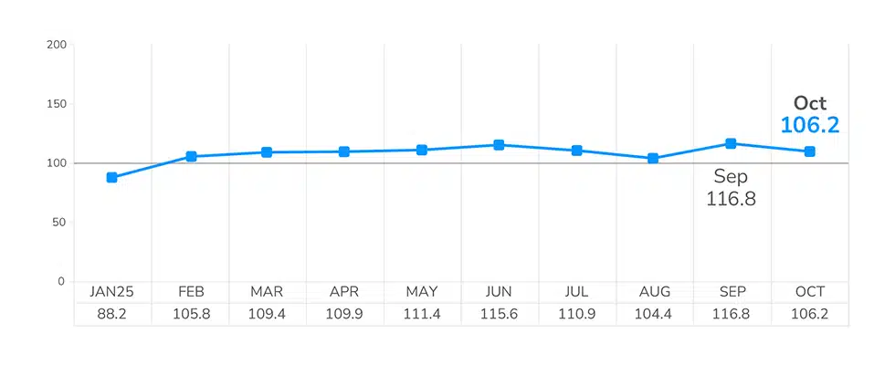 After climbing to its 2025 peak in September, the Index’s October reading of 106.2 reflects expected normalization following last month’s 25% surge in property listings. Historically, activity tends to soften between October and November as year-end seasonality sets in, but 2025’s elevated baseline shows that the market is performing well above last year’s levels.